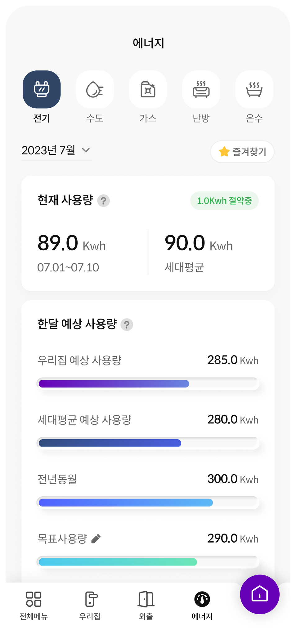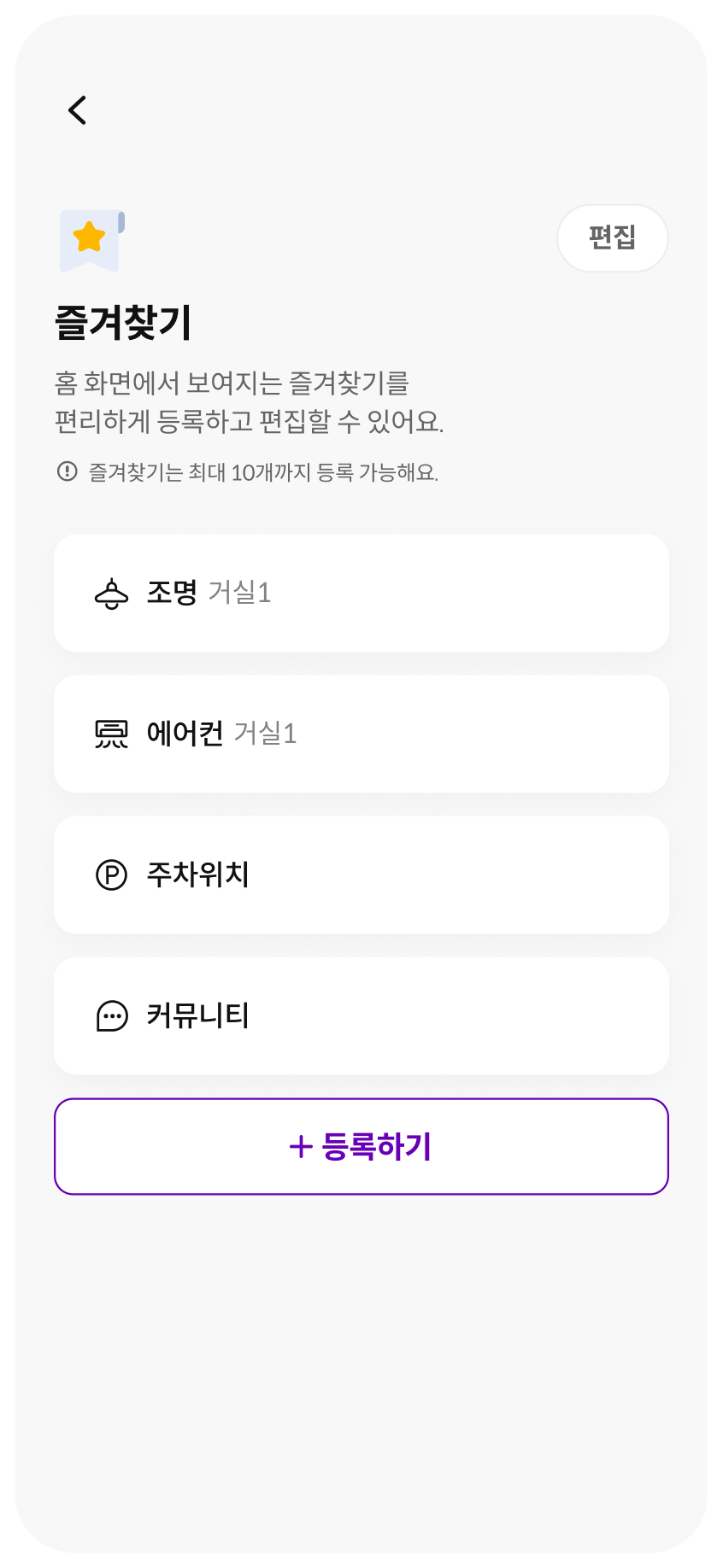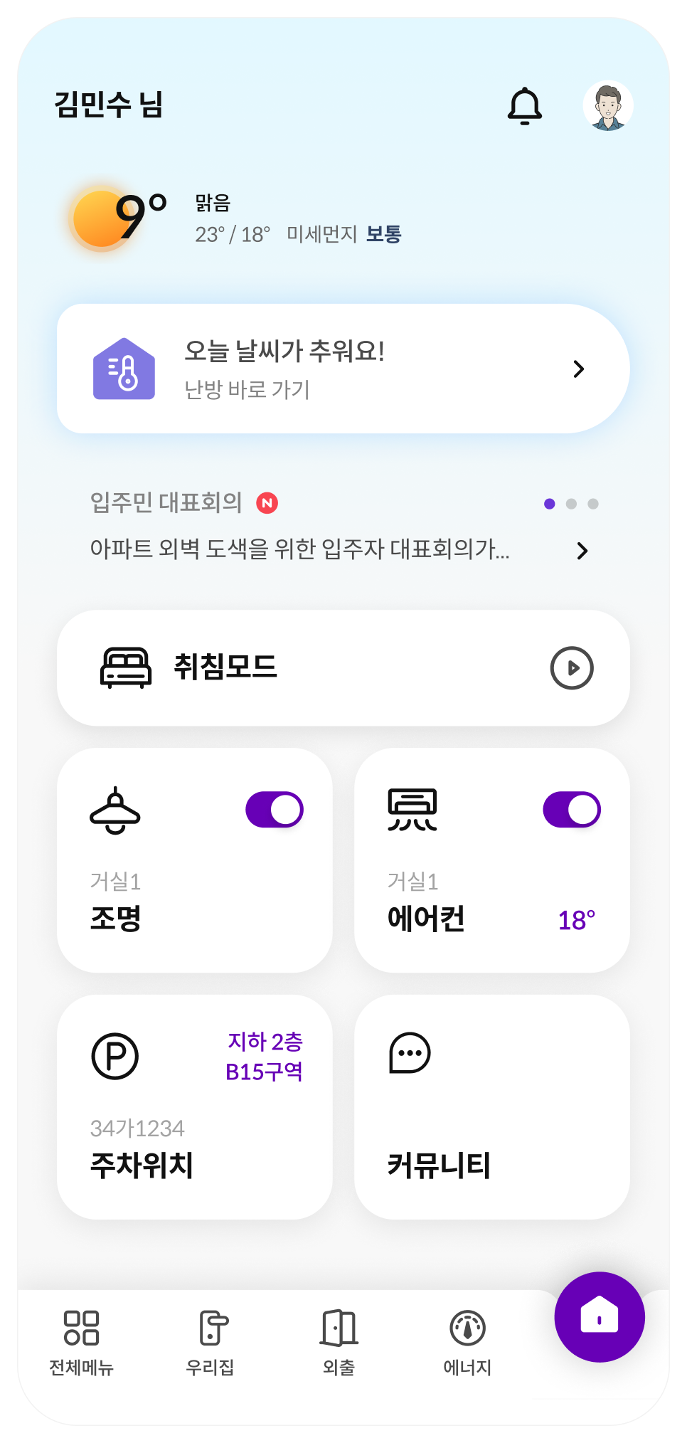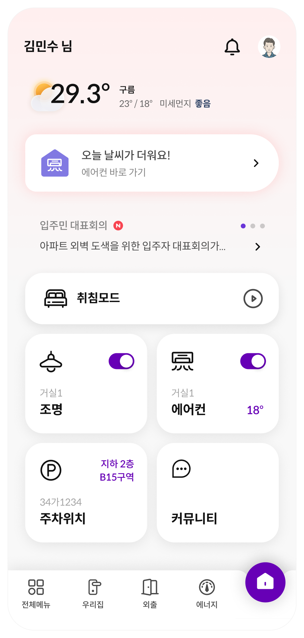 공간 별 각 기기 또는 아파트 소식 등의 메뉴를 메인홈에 표출하여