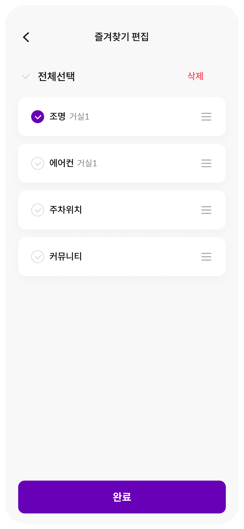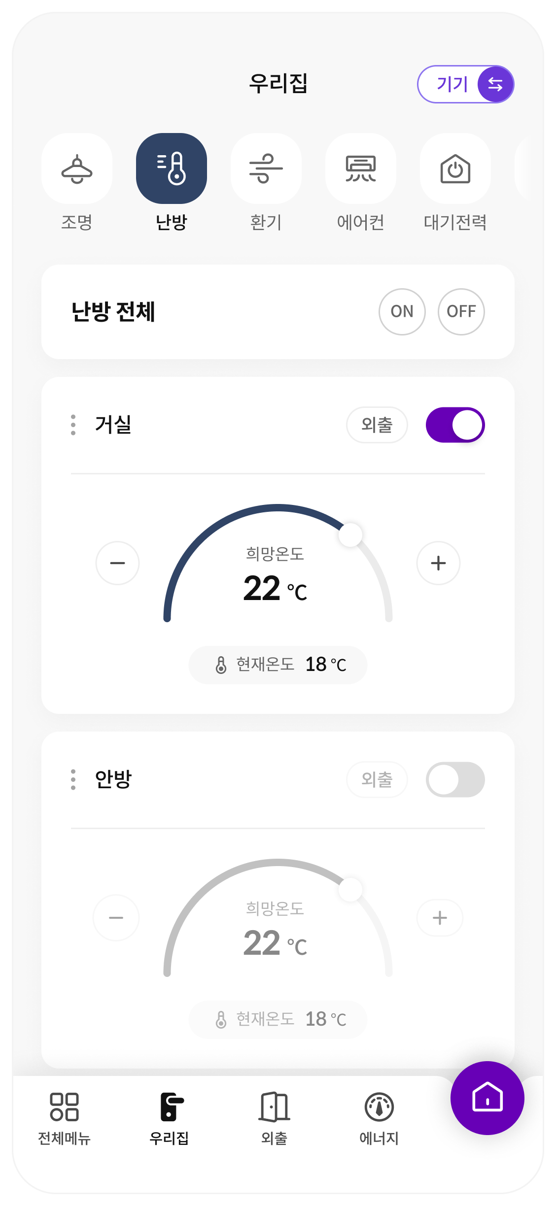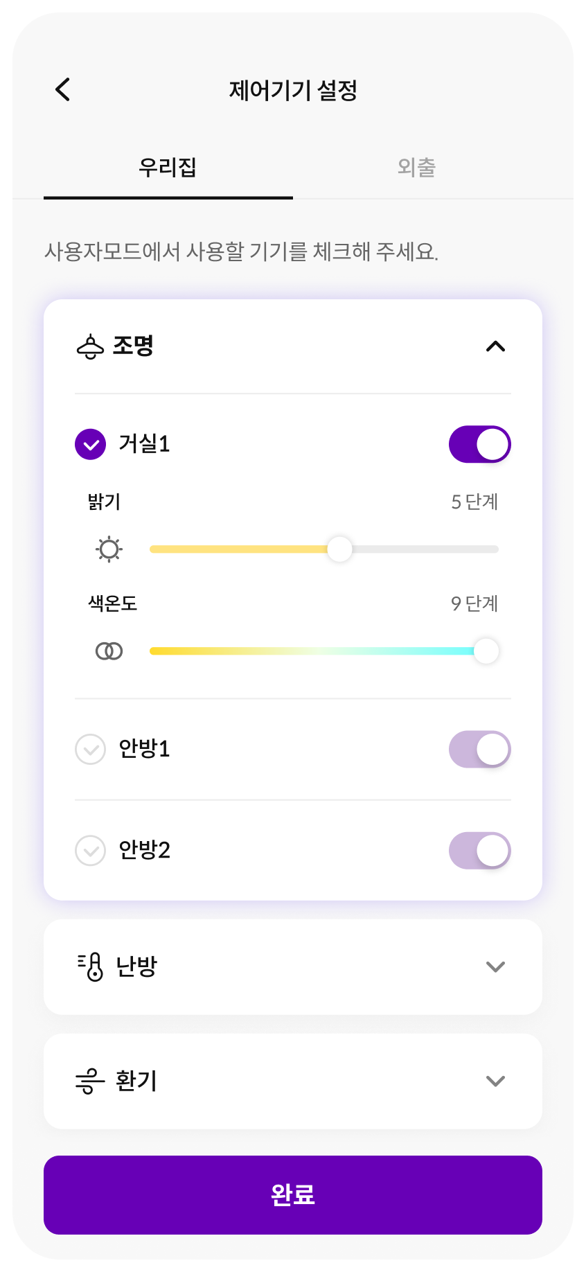 토글 또는 슬라이드, 버튼 등의 UI를 통해 각 공간마다 세부적으로 제어가 가능합니다.