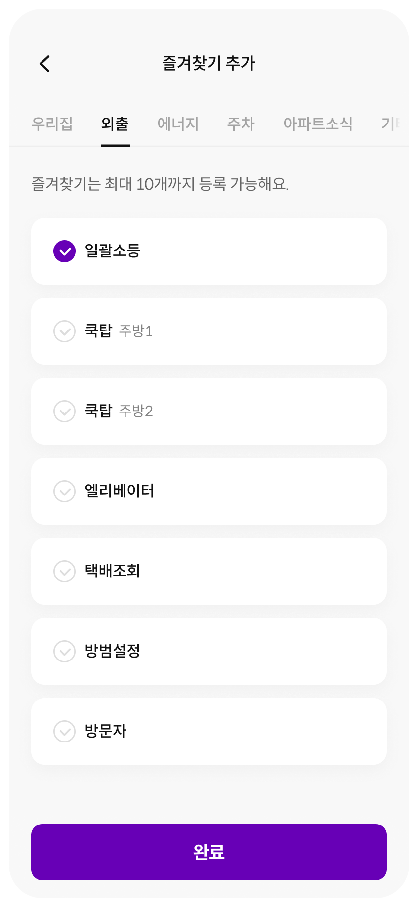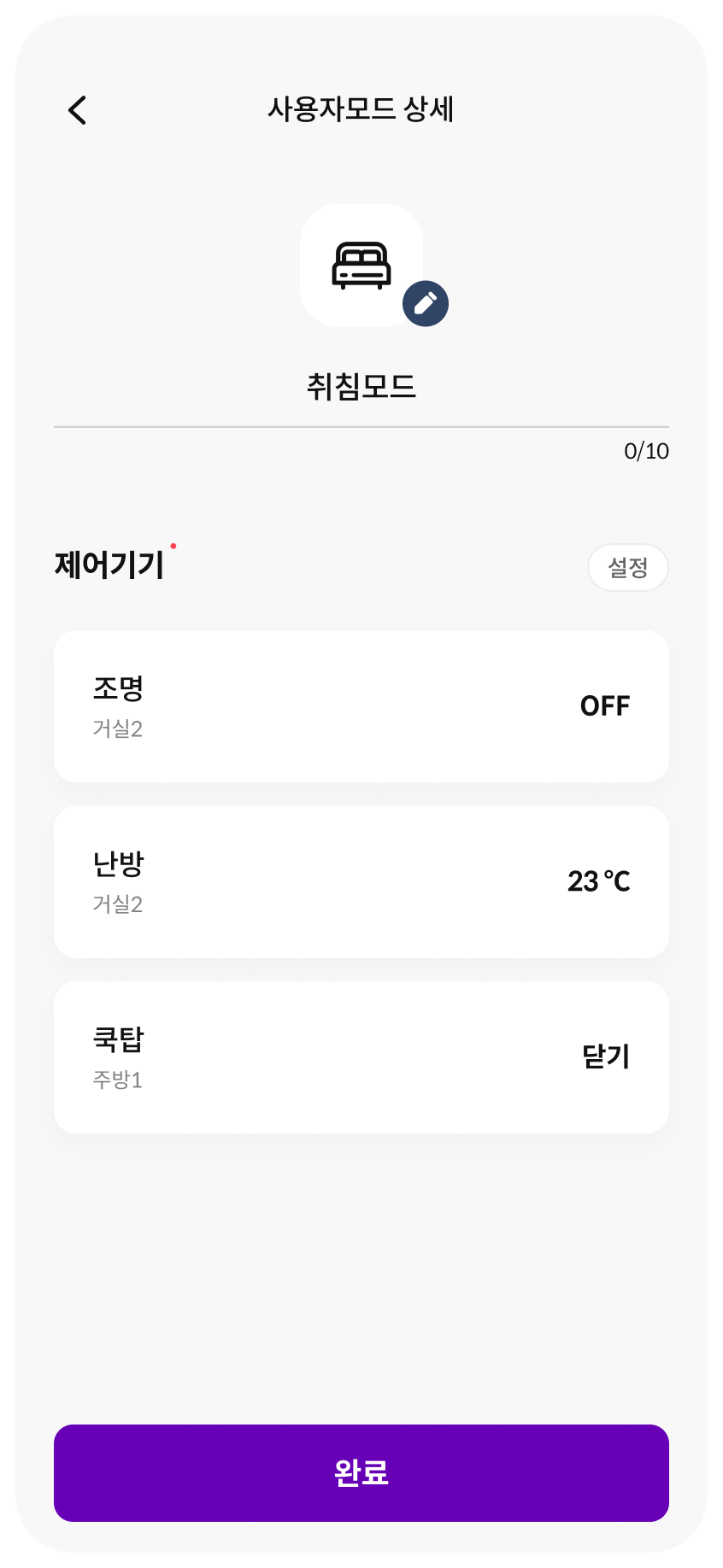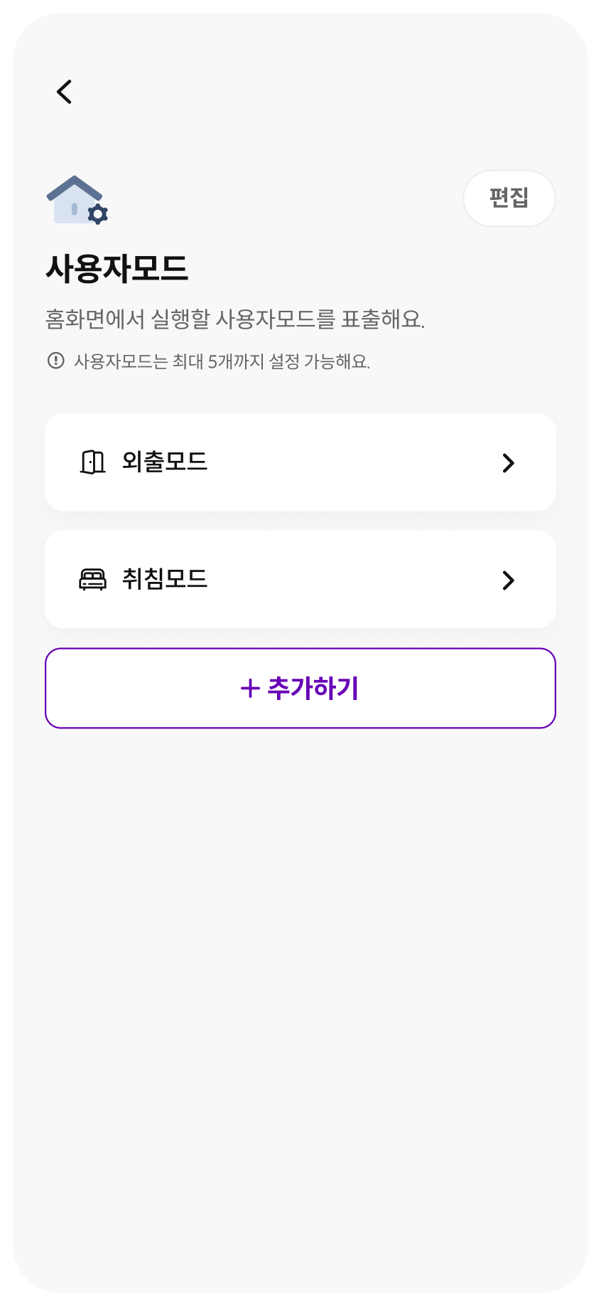 사용자의 외출, 취침 등의 라이프 스타일에 따라 제어가 필요한 기기들을 편리하게 커스텀할 수 있습니다.