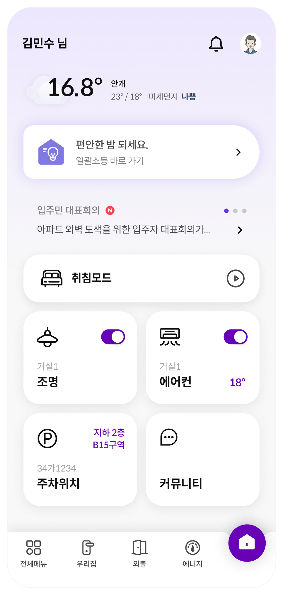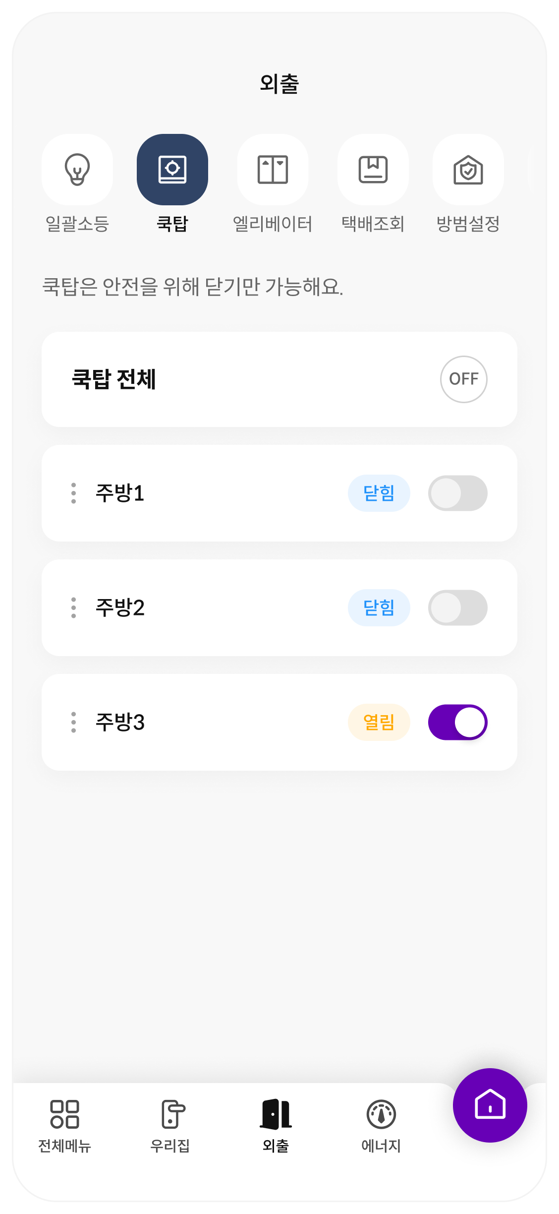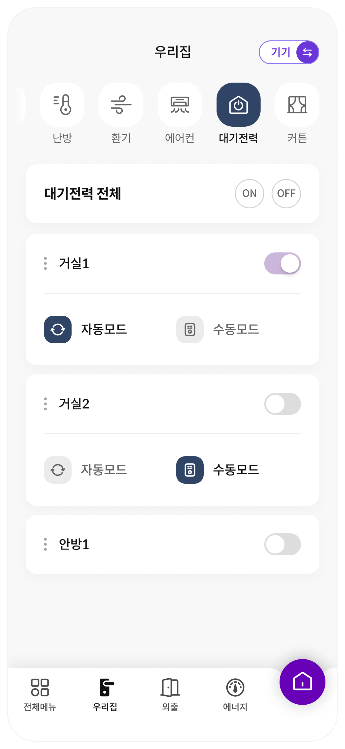 우리집 또는 아파트 내에 있는 기기 및 주거 환경을 한눈에 볼 수 있으며, ON OFF 버튼을 통해서 전체 제어를 할 수 있습니다.