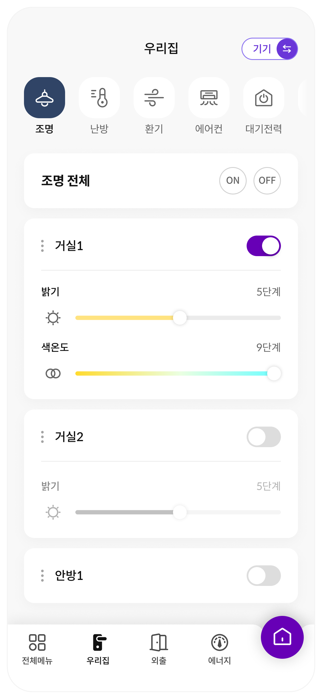 토글 또는 슬라이드, 버튼 등의 UI를 통해 각 공간마다 세부적으로 제어가 가능합니다.